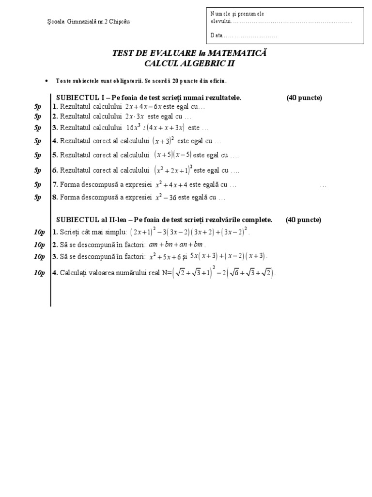 Test Calcul Algebric Descompuneri Cls A Vii A