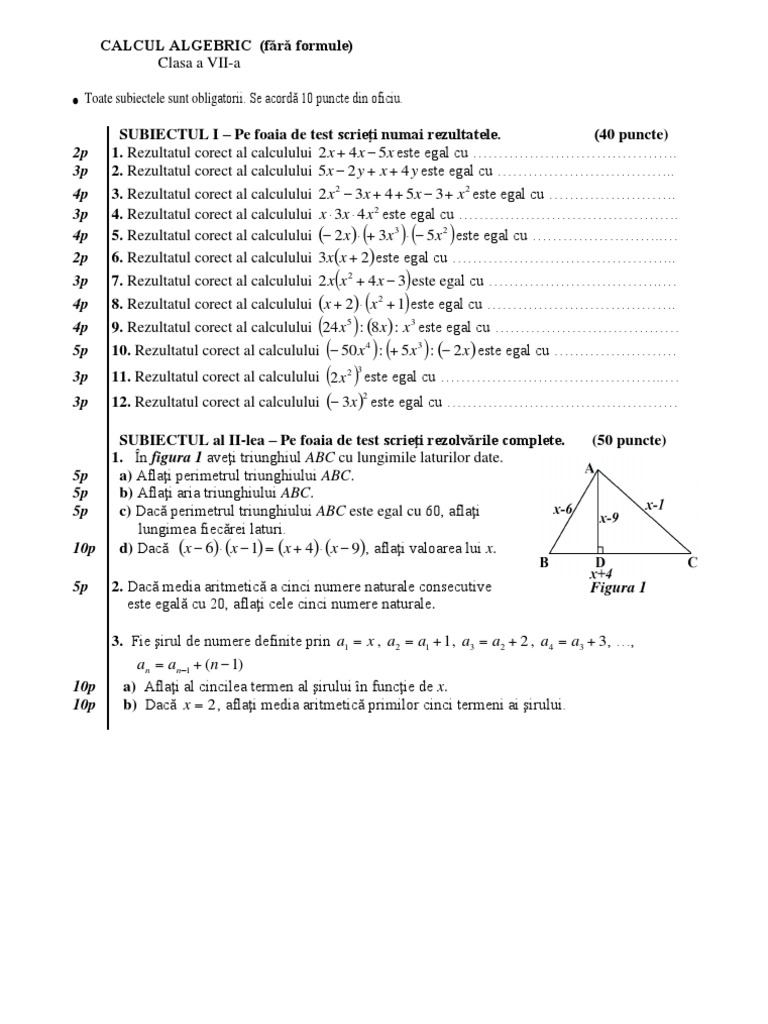 Clasa Vii Test Calcul Algebric Pana La Formule