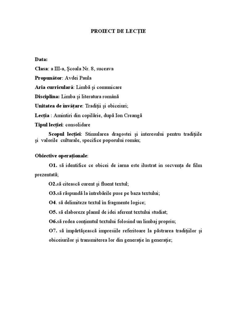 Proiect Proiect De Lectie Limba Si Literatura Romana Psihopedagogie 289321