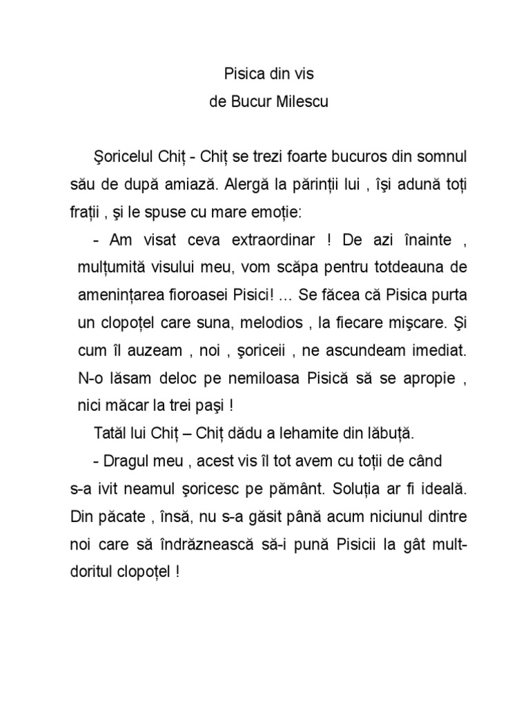Pisica din vis de bucur milescu. Alerg la prinii lui i adun toi fraii i le spuse cu mare emoie. Cni coresi numar pagini. Texte pentru clasele i iv poate fi a ta. Contine si textul suport.