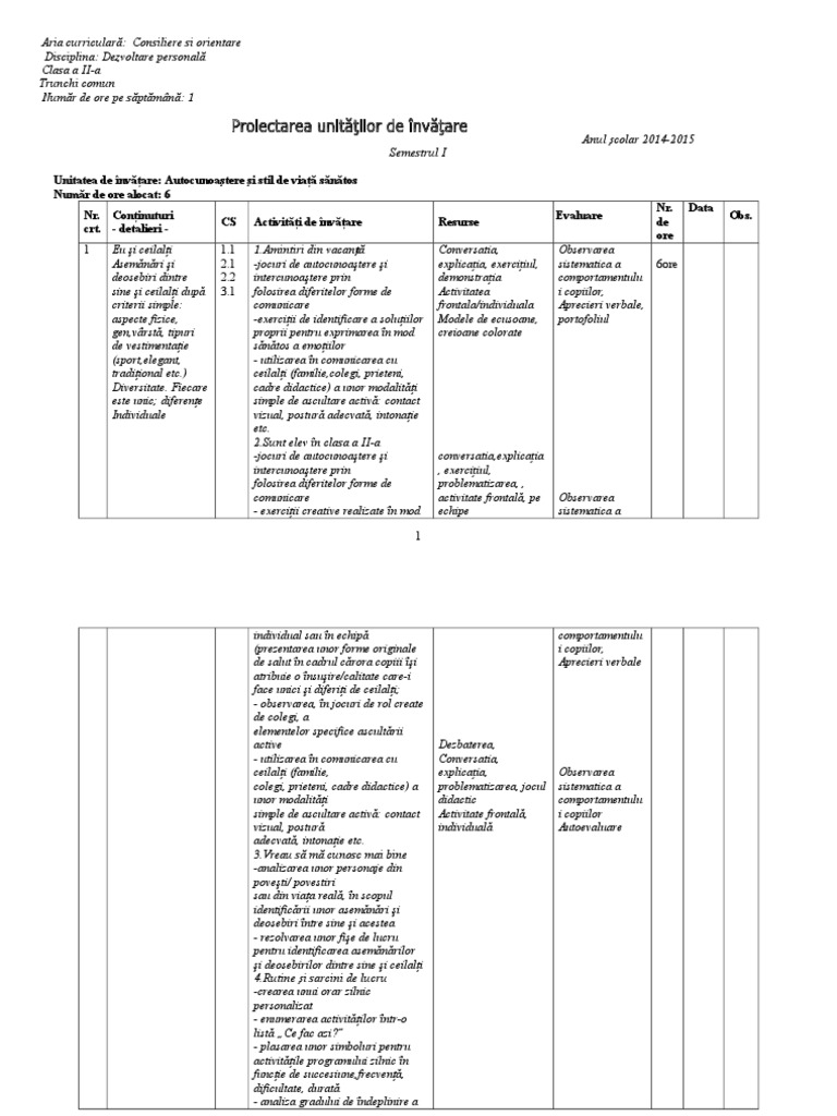 Planificare Pe Unitati De Invatare Dezvoltarea Personala Clasa A Iia 20142015