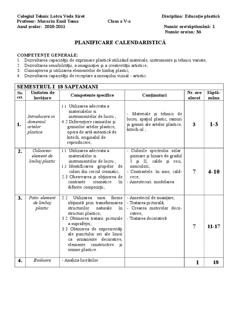 Planificare Educație Plastică Pentru Clasa A V A Planificari Clasa V A Planificări