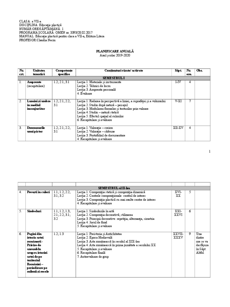 Planific Clasa A Vii A Educatie Plastica 2018 2019 Valdiane 22 08 2018