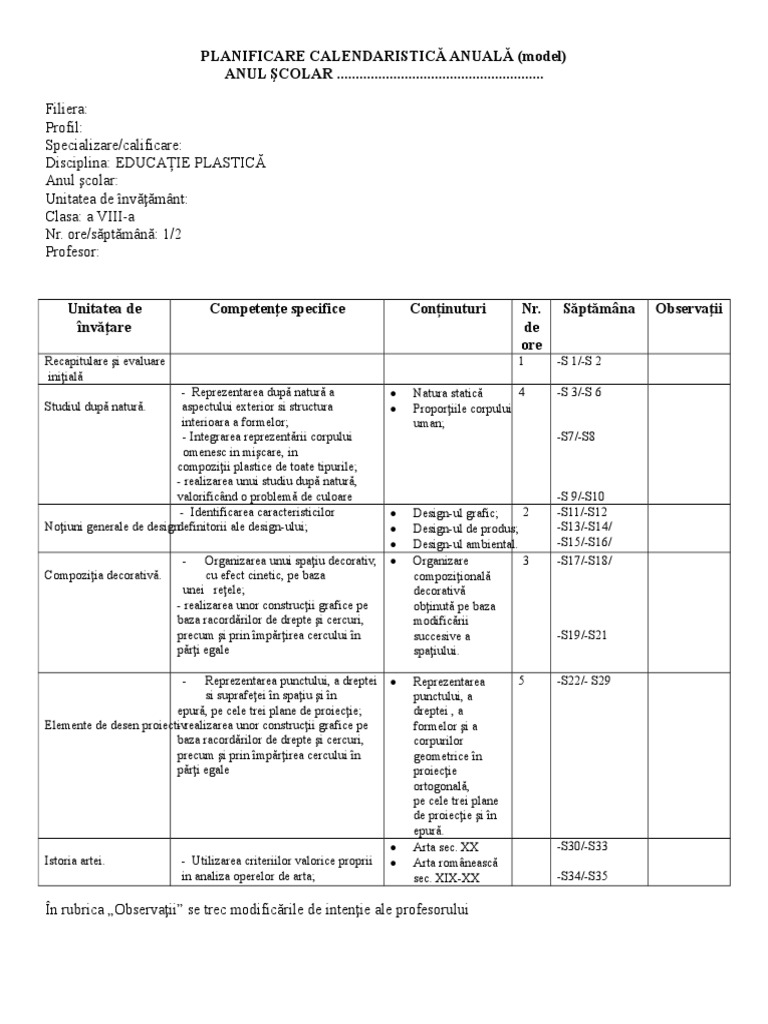 Planificare Educație Plastică Clasa A Vii A 2019 2020 Mercurius 14 09 2019