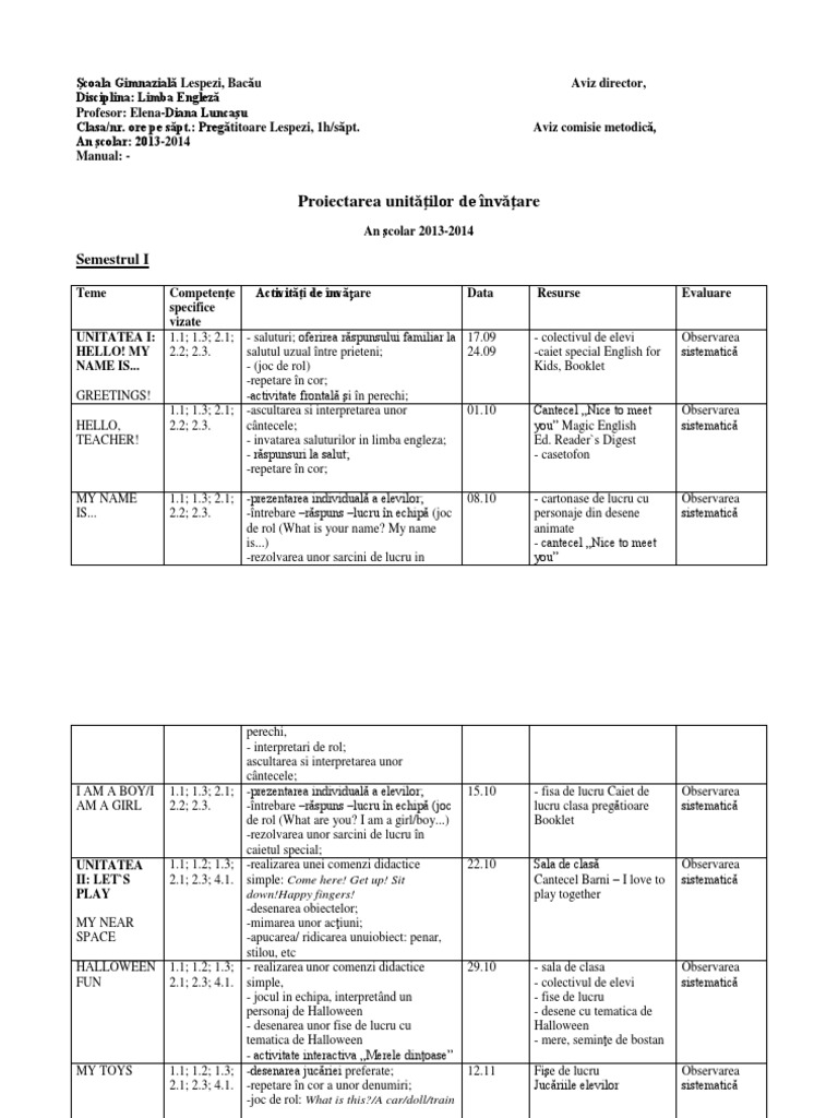 Planificare Pe Unitati De Invatare Clasa Pregatitoare