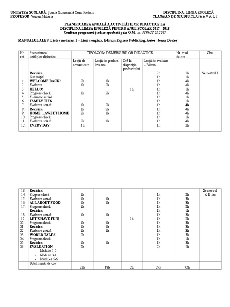Planificare Anuala Limba Moderna 1 Limba Engleza Cls A V A Right On