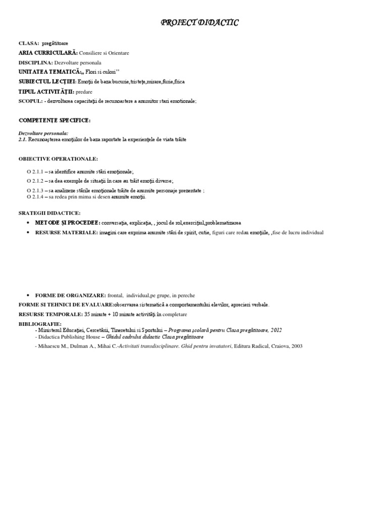 Proiect Didactic Dezvoltare Personala 2 1 Recunoasterea Emoţiilor De Baza Raportate La Experienţele De Viata Trăite